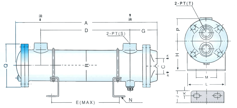 | 形式編號(hào) | A | C | D | E | G | H | J | K | L | M | N | P | Q | R | S | T | 最大流量L/min | 散熱面積m2 |
